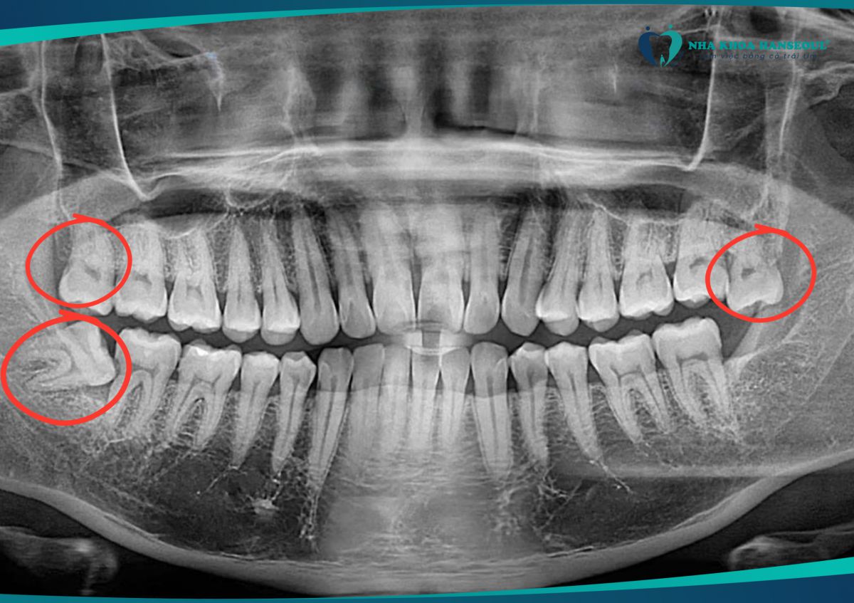 - Răng khôn hàm dưới mọc nghiêng 60 độ, gây tiêu xương, sâu răng số 7 và có nguy cơ lung lay răng hàm quan trọng.