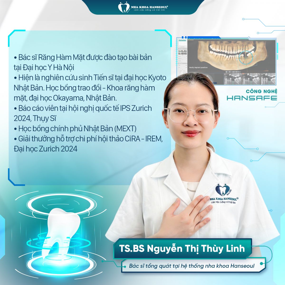 TS.BS Nguyễn Thị Thùy Linh – Bác sĩ Răng Hàm Mặt tổng quát tại hệ thống Nha khoa Hanseoul, được đào tạo bài bản tại Đại học Y Hà Nội. Hiện là nghiên cứu sinh Tiến sĩ tại Đại học Kyoto (Nhật Bản), đồng thời từng nhận học bổng trao đổi tại Đại học Okayama. Bác sĩ Linh còn là báo cáo viên tại Hội nghị quốc tế IPS Zurich 2024 (Thụy Sĩ), đạt nhiều học bổng và giải thưởng uy tín quốc tế như MEXT (Nhật Bản) hay CiRA – IREM (Đại học Zurich). Với nền tảng chuyên môn vững chắc và kinh nghiệm quốc tế, bác sĩ Linh luôn mang đến cho khách hàng trải nghiệm điều trị chuẩn xác, an toàn và hiệu quả.