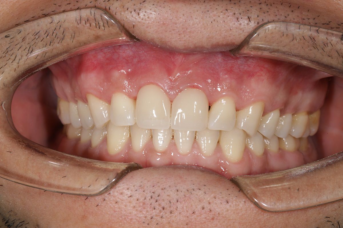 - Viền nướu quanh cùi răng có hiện tượng thâm nhẹ, ảnh hưởng đến tính tự nhiên của nụ cười.