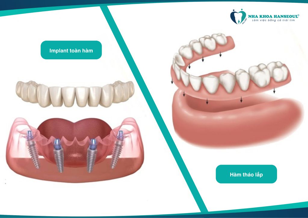 | Đặc điểm | Implant toàn hàm | Hàm tháo lắp |