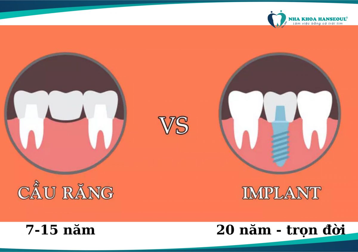 Trong khi đó, cầu răng chỉ dùng được 7-15 năm do răng trụ bị yếu dần. Hàm giả tháo lắp cần thay mới sau 3-5 năm do xương tiêu khiến hàm không còn khít.