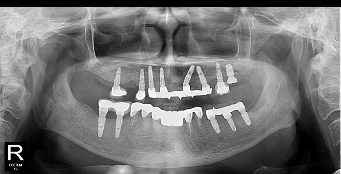 - Hàm trên: chỉ còn lại vài trụ Implant cũ đã được đặt cách đây hơn 10 năm, hiện nay có dấu hiệu tiêu xương quanh trụ, không còn đảm bảo chức năng nâng đỡ phục hình.